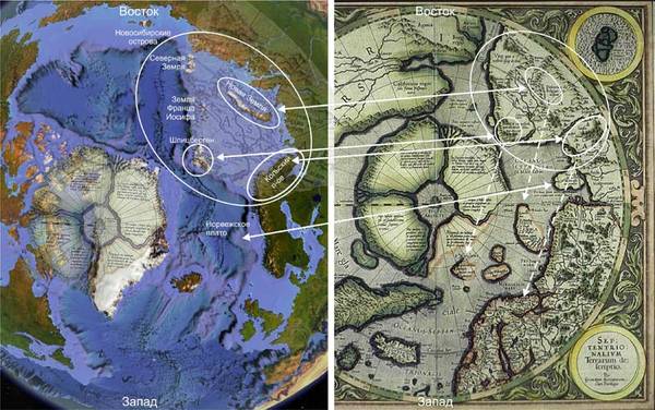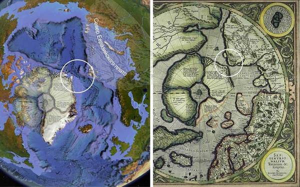 Теперь рассмотрим особенности таинственной карты Меркатора 1595 года. Для того чтобы разобраться во всех ее странностях, нужно сравнить ее с современными рельефными картами морского дна Арктики. Для начала восстановим историческую справедливость и переместим Гиперборею Меркатора на то место, где находился Северный полюс до потопа (Ил. 37).
