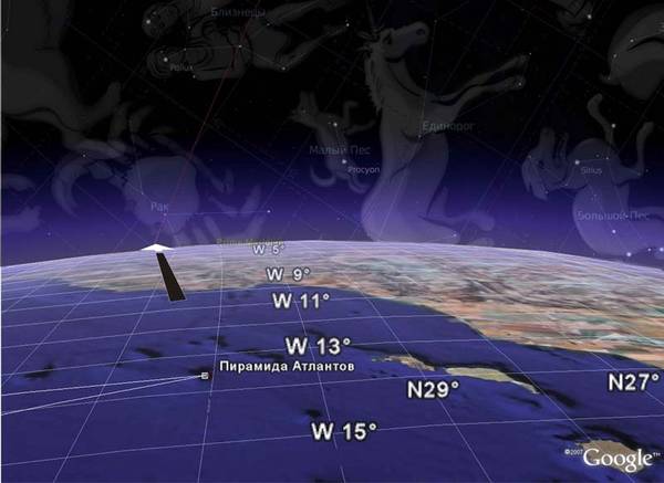 Изображение, словно экран монитора, переносит нас во времени и пространстве на высоту нескольких десятков километров над Землей в район южнее основного архипелага Атлантиды. Перед нами остров, на котором находится их основной центр связи – великая пирамида атлантов. Проведем стрелку от пирамиды в направлении на восток, к точке восхода Солнца в день весеннего равноденствия и, далее, спроецируем ее на небо. Эта стрелка указывает на "первую минуту первого градуса головы Рака". Так выглядело небо и звезды на нем в день катастрофы. Теперь представьте, как слева от нас со стороны северной Сибири над севером Европы, а затем южнее Британских островов, которые тогда были еще частью материка, в юго-западном направлении проносится гигантский астероид. Проходит минута, другая, и планету сотрясает страшный удар. От этого удара, рассказывает древний текст: