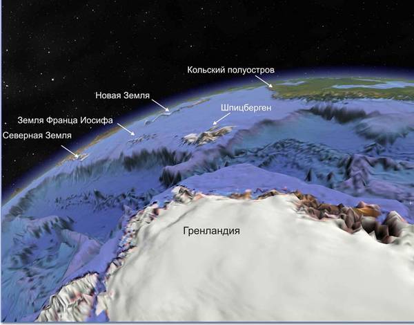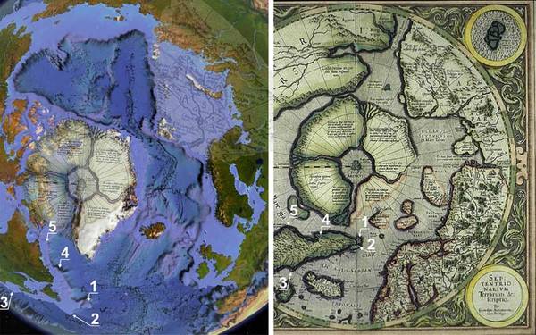 В результате незнания геологической истории Земли, Меркатор дважды изобразил на своей карте один и тот же район Арктики (допотопного и послепотопного периодов) со смещением в 15° относительно друг друга. Справедливости ради стоит сказать, что такого рода "накладки" встречаются и на других древних картах, например, на портулане Пири Рейса. Большой остров, изображенный Южнее Гипербореи – это не Гренландия, как считают некоторые исследователи и сам Меркатор. Это полуостров Лабрадор. Сложность идентификации этого "острова" в том, что он перекочевал на карту Меркатора с сильно искаженного варианта древней допотопной карты, имевшей иную проекцию и ориентацию. Полуостров Лабрадор изображен на карте так, как его очертания (до потопа) были бы видны, если бы картограф рисовал карту, находясь в космосе над Исландией на высоте порядка 7000 км! Для сравнения взгляните на Ил. 43, показывающую рельеф морского дна в этом районе с указанной высоты.