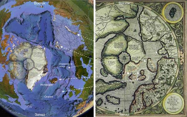 Попытка примирить данные карты, привела к тому, что Новая Земля, Шпицберген, Кольский полуостров и прилегающие к ним районы оказались у Меркатора на 1850 км (около 1150 миль) западнее их истинного положения (Ил. 41). Исландия и затонувший впоследствии остров Огигия35, скопированные с допотопного источника, оказались между Шпицбергеном и Новой Землей – на 15° восточнее их истинного положения (Ил. 42).