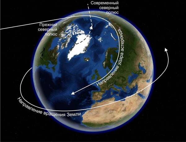 Удар астероида под углом к плоскости вращения Земли привел к тому, что ось вращения планеты начала постепенно наклоняться, разворачиваясь Северным полюсом к югу (Ил. 47). Сначала Северный полюс отклонился на 20° от исходного угла наклона оси, который до потопа составлял примерно 9°. С течением времени, в результате влияния сил инерции, угол отклонения оси вращения постепенно менялся. Согласно древнему тексту, Земля после удара астероида частично перевернулась. Затем стороны света поменялись своими местами. Солнце всходило на западном горизонте, а садилось на восточном. Геродот в своей "Истории" писал: