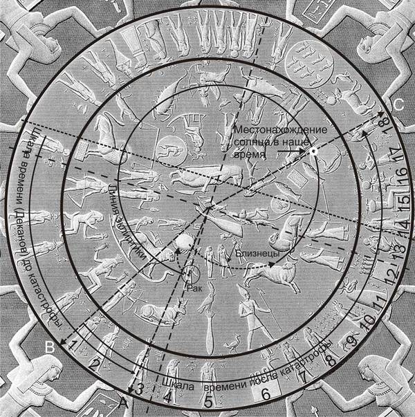 Знание цикла прецессии было для жрецов жизненно необходимо. Оно давало возможность произвести соответствующие вычисления для расчета календаря и создания системы мер, которая впоследствии станет основой древнеегипетского Канона, на базе которого поколения жрецов будут осуществлять планирование и строительство сооружений, настроенных на основные энергетические ритмы Земли и Космоса. Подобная работа по пересмотру цикличности проводилась не только в Египте, но и в Китае, где, как рассказывает древний текст, император отправил гонцов на четыре стороны потемневшего света, чтобы заново определить Север, Восток, Запад и Юг и составить новый календарь. Несмотря на то, что 12506 лет назад жрецы Атлантиды осуществили синхронизацию земных и астрономических часов, оставив об этом соответствующие записи, современные астрологи по сей день игнорируют внесенные тогда поправки, продолжая опираться в своих расчетах на космопланетарную цикличность, критически изменившуюся вследствие судьбоносного удара астероида более 13 тыс. лет назад. Для того чтобы пролить свет на те события, попутно сверяя их с астрологическими часами, обратимся к Дендерским Зодиакам, которых в древнеегипетском храме ИУН-ТА-НЭЧЕТ (в Дендере) было несколько. Система календарей в древнем Египте благодаря хорошо развитой астрономии была разработана блестяще. Календарь и шкала времени Дендерских Зодиаков строились на основе более древних текстов и длительных астрономических наблюдений. Для правильного понимания записей о доисторических событиях рассмотрим шкалу времени круглого Дендерского Зодиака Ил. 49. Шкала внешнего круга зодиака составлена из фигур – Деканов, символизирующих ход времени. Идут Деканы в направлении против часовой стрелки. Это говорит о том, что они представляют собой не годовых деканов, а Деканов Большого Миротворного Круга, длительность которых на Дендерском Зодиаке непостоянна. Это естественно, так как до удара астероида и изменения угла наклона оси Земли прецессионный цикл был одним, а после удара астероида он стал другим. Поэтому плотность шагающих Деканов до стрелки А (в Раке) одна, а после катастрофы в секторе от стрелки В до стрелки С – другая. Перед рассмотрением особенностей шкалы времени на Дендерском Зодиаке, уточним, что после катастрофы один Большой Миротворный Круг (цикл прецессии) стал равен 25920 годам. Нахождение Солнца в наши дни на циферблате часов Дендерского зодиака показывает стрелка С. Это Декан 18 (Ил. 49). Время катастрофы показывает стрелка А, которая отмечает зону на линии эклиптики, где находилась первая минута первого градуса головы Рака в момент катастрофы (Солнце в Раке). Событие и его последовательность отражены на Зодиаке следующим образом. Перемещаясь по созвездиям вдоль линии эклиптики против часовой стрелки, восход Солнца в день весеннего равноденствия в год катастрофы пришелся на первую минуту первого градуса головы Рака. Стрелка А, указывая эту дату на зодиакальных часах, касается первой минуты первого градуса круга зоны, где должна быть голова Рака на линии эклиптики. В этот момент произошла катастрофа, вследствие которой Рак делает неестественное перемещение назад и вверх, заняв место над головой Льва. Удар астероида, сломавший прецессионный механизм, привел к тому, что зодиакальное время "повернуло вс