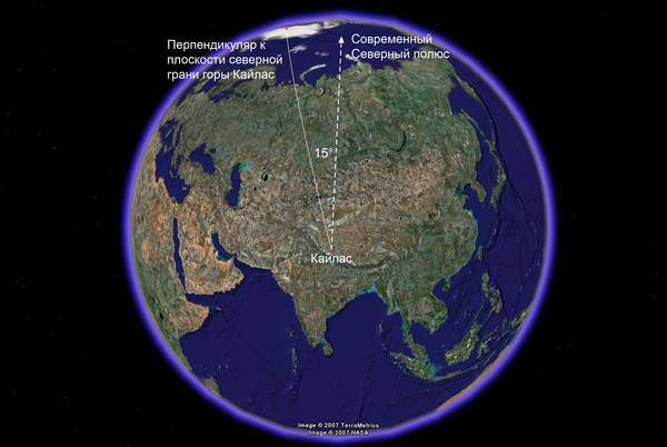 Обратите внимание на плоскость северной стены Кайласа. Она смотрит не на север, а имеет отклонение, равное 15° западнее северного направления. Но, если в древности северная стена смотрела на Меру, тогда нужно опустить перпендикуляр к плоскости "отражателя" и, продлив его в северном направлении, посмотреть, куда он нас приведет. Проследуем этим путем (Ил. 31).