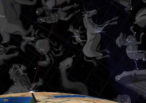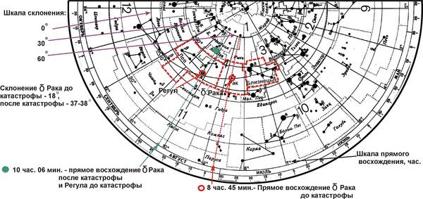 Вместо привычного и естественного движения против часовой стрелки относительно восходящего на горизонте Солнца созвездия начали выкатываться из-за горизонта по часовой стрелке. Проведенная на Ил. 46 к горизонту стрелка, указывавшая "место отдыха Солнца" перед падением астероида в первой минуте головы Рака, начала медленно смещаться вместе с горизонтом назад (вниз) к созвездию Льва (Ил. 48).
