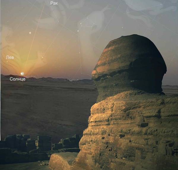 Чтобы понять, что стоит за этими словами, восстановим в памяти некоторые основы знаний предков. Издревле существовала только одна наука, с помощью которой можно было через тысячелетия с очень высоким уровнем точности передавать информацию о важнейших событиях и датах в истории Земли. Эта наука — астрономия. Для точной датировки событие должно быть "привязано" к положению звезд и восходу Солнца. Роль инструмента для такого рода "привязки" играли особые сооружения: пригоризонтные обсерватории, обелиски, пирамиды или Великий Сфинкс в Гизе, ориентированные точно по сторонам света. По замыслу строителей, Сфинкс являлся астрономическим маркером, для чего его тело было сориентировано точно на восток, на точку восхода Солнца на горизонте в день весеннего равноденствия (Ил. 44).