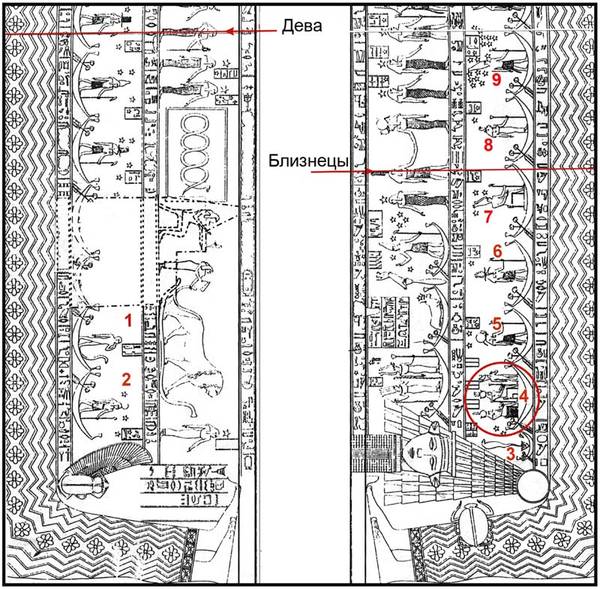Символика линейного Зодиака несколько отличается от символики круглого, потому что круглый Зодиак отражает ситуацию в астрологическом времени, а линейный – в физическом, движущемся всегда поступательно. В левой и правой половинах линейного Зодиака Деканы (время) плывут в ладьях вдоль тела богини неба Нут, символизирующей космическое пространство. В каждой ладье должно быть по одному Декану, если они отражают нормальный ход событий. Начнем рассмотрение с левой половины. Направление движения Деканов сверху вниз по левой половине, затем – переход на правую, отражает ход против часовой стрелки как и на круглом Зодиаке. Под созвездием Льва изображены Деканы 1 и 2 – каждый в своей ладье. Все идет нормально, своим чередом. Затем Нут порождает Скарабея (Рака). Время переходит на правую половину. Две половины – это символическое деление шкалы времени (исторические эпохи) на две части: левая – до потопа, правая – после него (рождение нового времени). На второй половине Зодиака, в секторе родившегося Скарабея (Рака) в самом начале вдоль тела Нут плывет маленькая ладья с Деканом-Коброй, стоящей на лотосе 3, а за ней, в одной ладье изображены сразу три Декана 4. Вот оно – наложение. Этот участок на рисунке обведен кругом. Три Декана в одной ладье – это указание на необычное событие, когда в отрезок времени для одного Декана, уместилось три. Три Декана оказались в одной ладье потому, что Солнце после катастрофы совершило зодиакальный откат назад на два Декана, а затем возобновило нормальное движение вдоль линии эклиптики по Декану 1 – в сумме три. Иными словами, за время, отведенное одному Декану, Солнце по небу прошло три Декана, что соответствует записи на круглом Дендерском Зодиаке. Объединив записи обоих Зодиаков можно с уверенностью утверждать, что вся зодиакальная последовательность события была следующей: Земля прошла через Эпоху Льва, вступила в Эпоху Рака, пробыв там первую минуту первого градуса, то есть один укороченный Декан (поэтому ладья, в которой сидит Кобра – маленькая). И тут происходит катастрофа. Зодиакально Земля совершает "скачок во времени", откатываясь в обратном направлении в Эпоху Льва. А затем, пройдя одну и ту же зону "по эпохе Льва" от его сердца к Раку дважды, Земля возвращается в тоже место, где уже находилась в момент катастрофы. Иными словами, часть Эпохи Льва и начальный Декан Эпохи Рака был пройден Землей два раза. Маленький Декан 3 и следующая за ним ладья 4 с тремя Деканами, говорят, что период с момента катастрофы и "поломки прецессионного механизма", "отката зодиакального времени назад" до восстановления механизма прецессии был достаточно коротким по сравнению с нормальным ходом зодиакального времени, когда три Декана по 720 лет равны Эпохе в 2160 лет. В рамках физического времени все произошло в течение одного Декана. Все эти странности с Деканами (при сопоставлении Зодиаков, учитывая погрешность, связанную с постепенным, еле заметным изменением угла наклона оси Земли) дают тот "разнобой" в 608 лет, который существует между современной астрономией и астрологией. Не веря в глубину знаний древних, ни астрономы, ни астрологи даже не догадались поискать ответ у египтян на это очевидное разночтение. Ну а египтологи, археологи, историки недостаточно подкованы в фундаментальных науках, чтобы, как минимум, правильно сфо